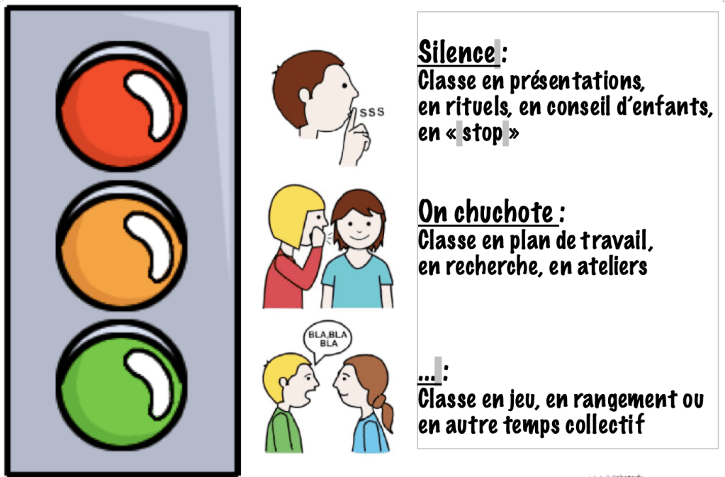 ROUGE = classe en silence car présentations ou rituels ou conseil d’enfants.