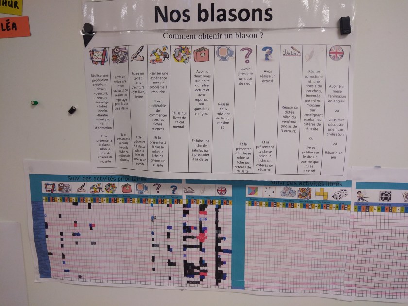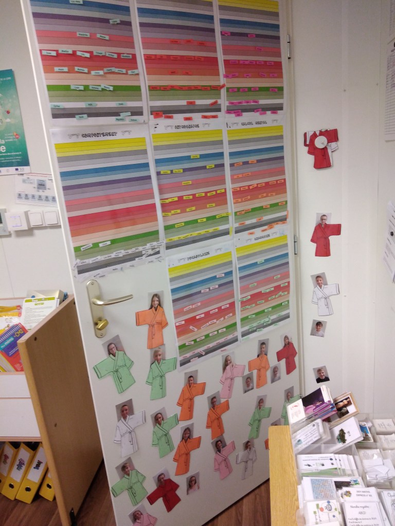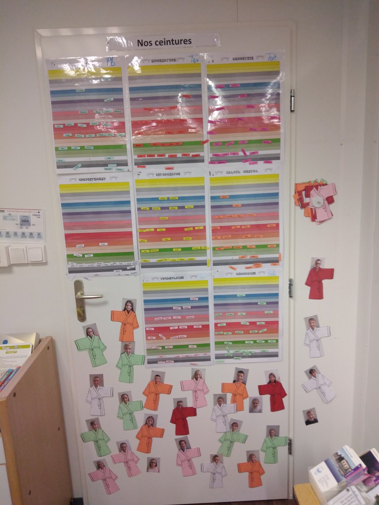 Les élèves passent leurs ceintures de comportement après avis du conseil d’élèves hebdomadaire. Pour gérer les bavardages et l’attitude en classe, nous avons un système de permis. Si je respecte les règles de la classe construites en classe, j’ai le droit de me déplacer sans demander la permission. C’est un principe de confiance.