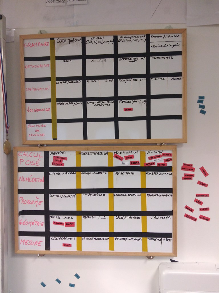 Tous les matins, les enfants ont un temps de plan de travail en maths et en français. Ils choisissent leurs objectifs et avancent à leur rythme dans les ceintures.